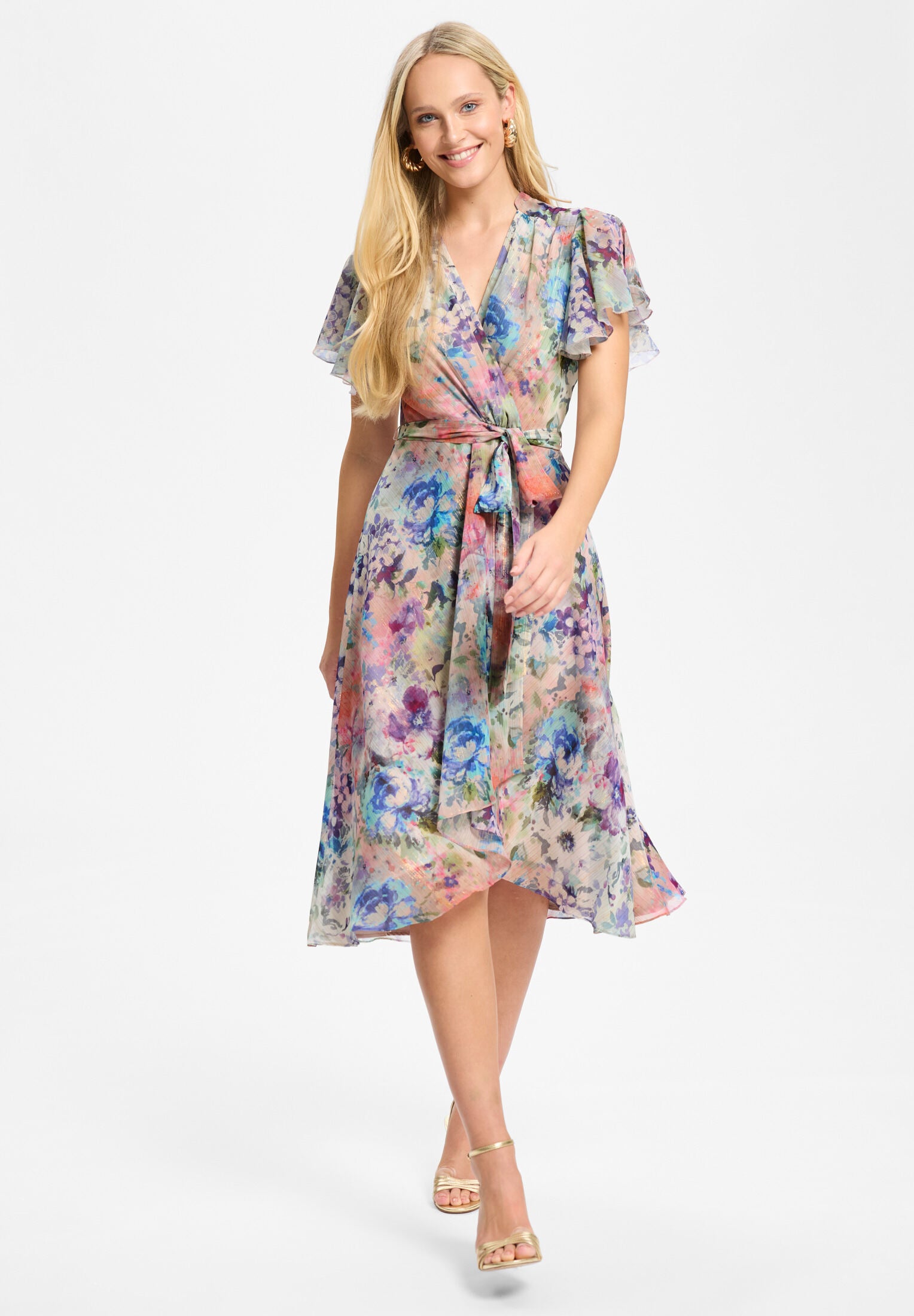 Midi Kleid in Wickel Optik aus bedrucktem Chiffon mit Metallicfäden